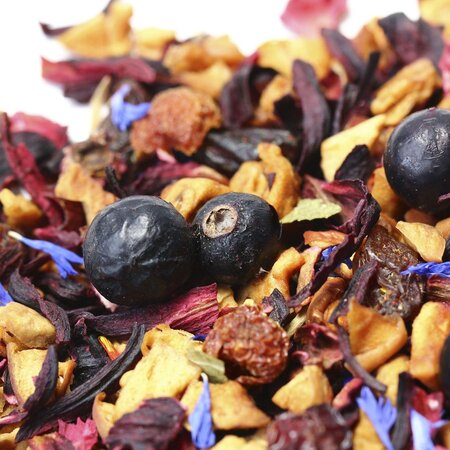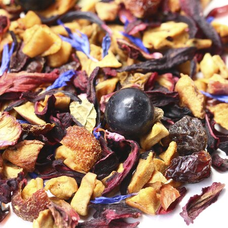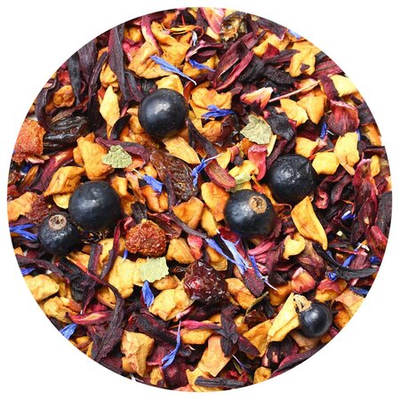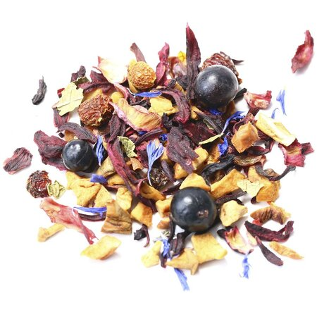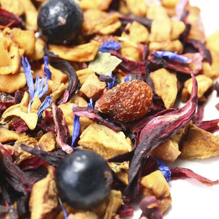 Многокомпонентный фруктовый чай не оставит равнодушными любителей оригинальных сочетаний кусочки яблока, красный изюм, измельченные плоды шиповника, каркадэ, ягоды черной смородины, лепестки красного и синего василька и лист смородины создают удивительно гармоничную симфонию вкуса.