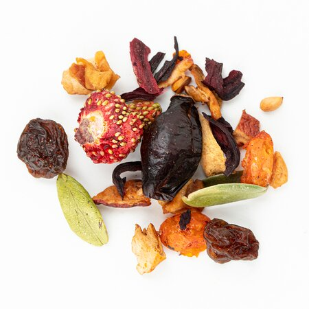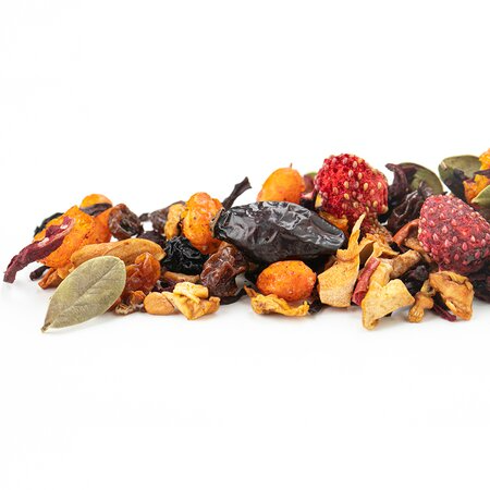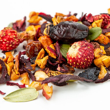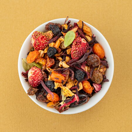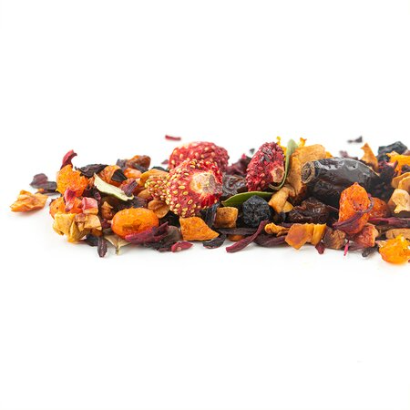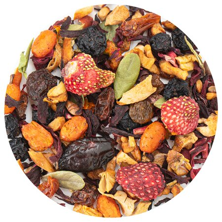 Каркаде, кусочки яблок, изюм, плоды аронии, ядро шиповника, ягоды земляники, ягоды облепихи, листья брусники, аромат "Ягодка диковинная"
