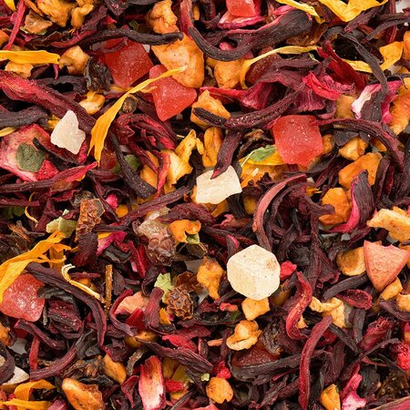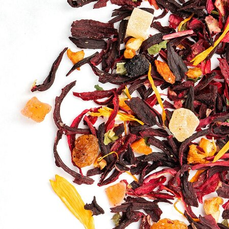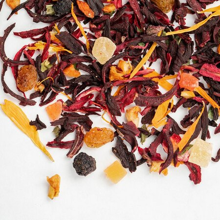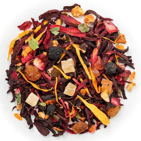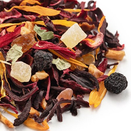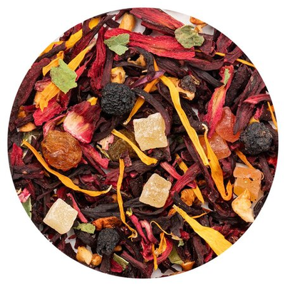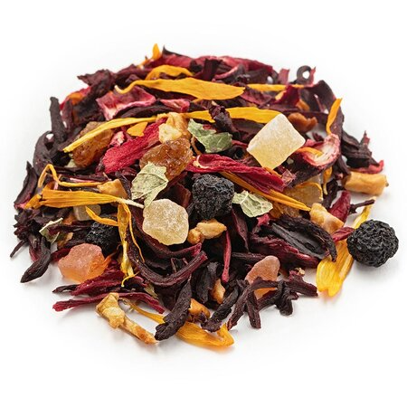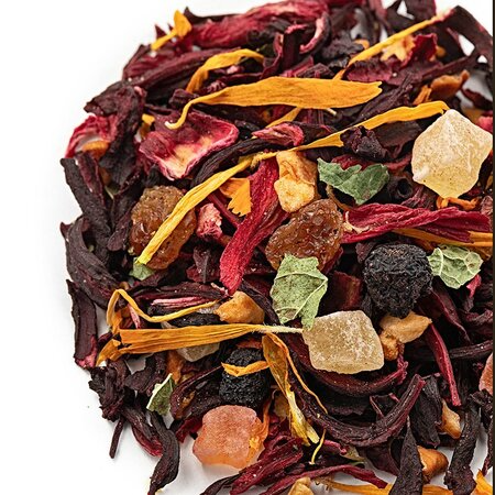 Удивительный фруктовый смузи в одном стакане обещает этот чай, в список ингредиентов которого входит гибискус, красный изюм, кусочки ананаса и яблок, цедра апельсина, кусочки папайи, лепестки календулы и листья смородины.