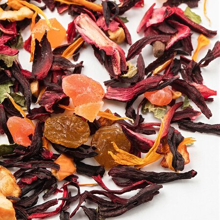 Каркадэ, кусочки яблок, изюм красный, кусочки ананаса, плоды аронии, кусочки папайи, листья смородины, цедра апельсина, лепестки календулы, аромат дикого персика.