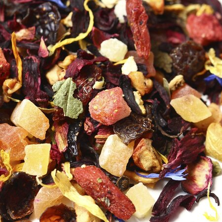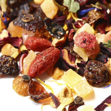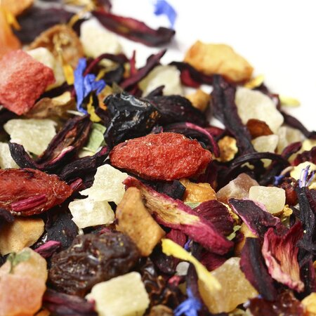 Сочный насыщенный микс на основе каркадэ вобрал в себя аппетитные кусочки ананаса, яблок, папайи и клубники. Смесь дополнена красным изюмом, ягодами Годжи и измельченными плодами шиповника, приправлена цедрой апельсина, листьями смородины и цветочными лепестками календулы и василька. О более лакомом сочетании невозможно мечтать!