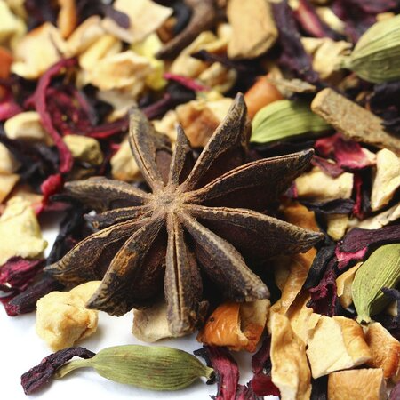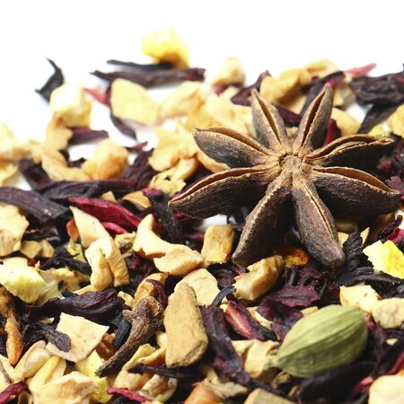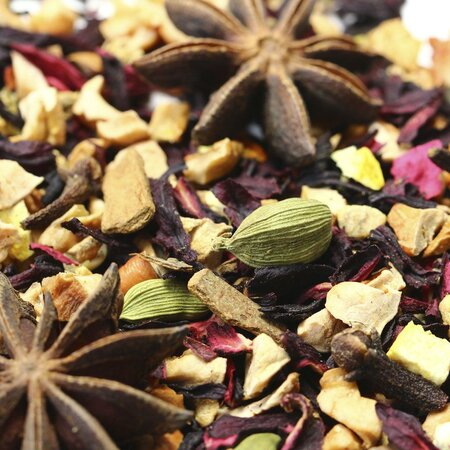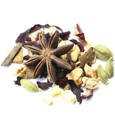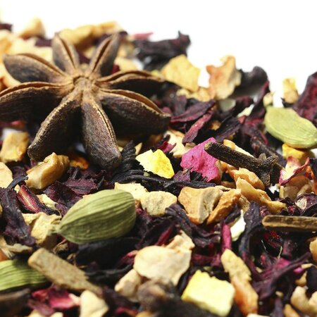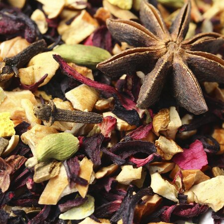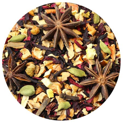 Кусочки яблок, каркадэ, кусочки корицы, кусочки имбиря, бадьян, кардамон, гвоздика, кусочки апельсина с цедрой, аромат восточных пряностей.