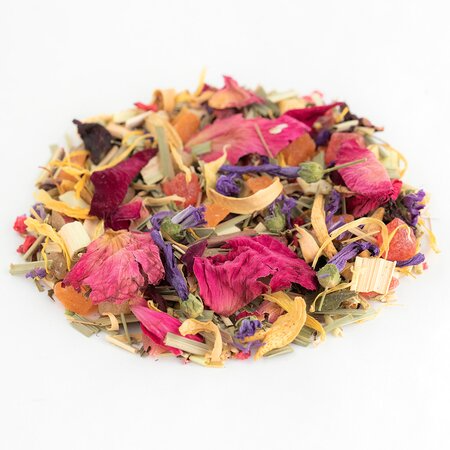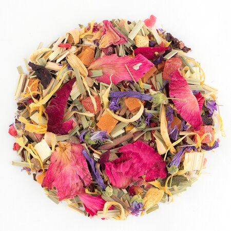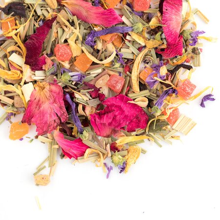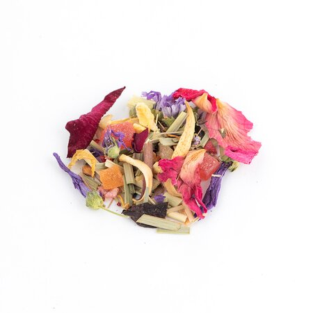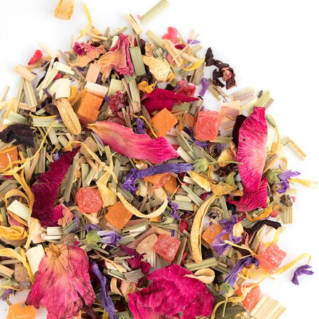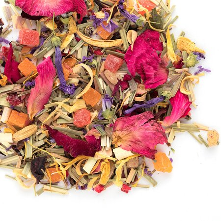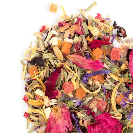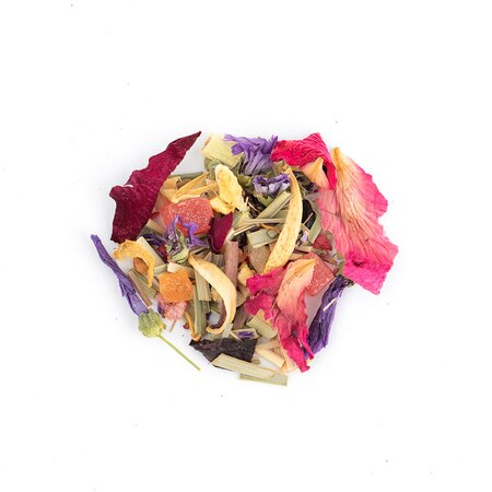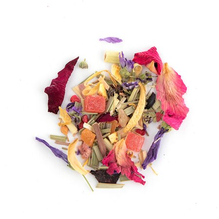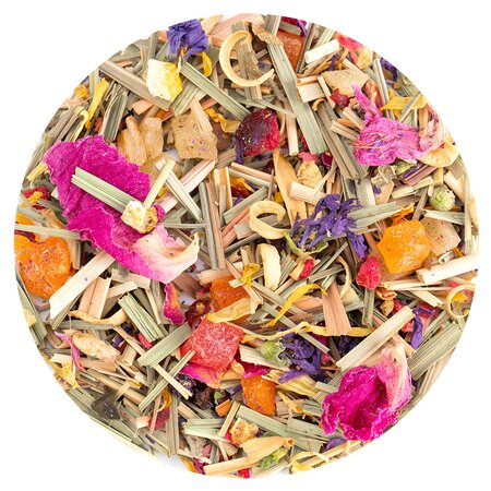Кусочки ананаса, лемонграсс, каркадэ, шиповник измельченный, цветы апельсина, цветы мальвы, кусочки малины, кусочки апельсина с цедрой, кусочки клюквы, лепестки календулы, листья ежевики, кусочки и ягоды малины, лепестки василька, лепестки розы, лепестки пиона, аромат садовых ягод.