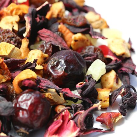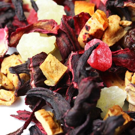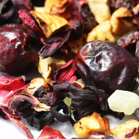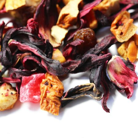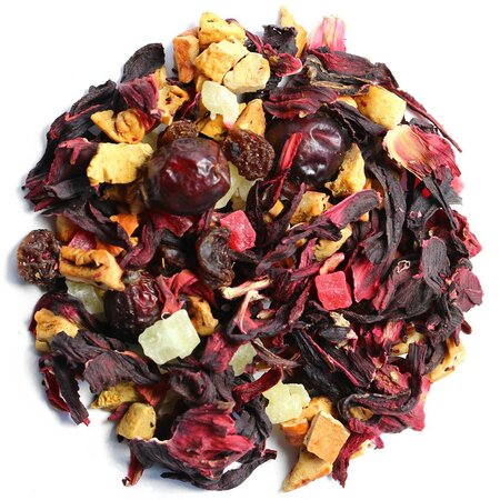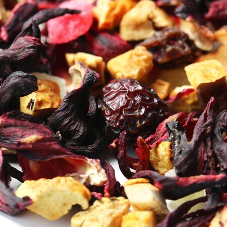 Каркадэ, кусочки яблок, кусочки ананаса, изюм красный, плоды шиповника целые, аромат бабушкиного варенья.