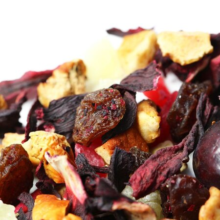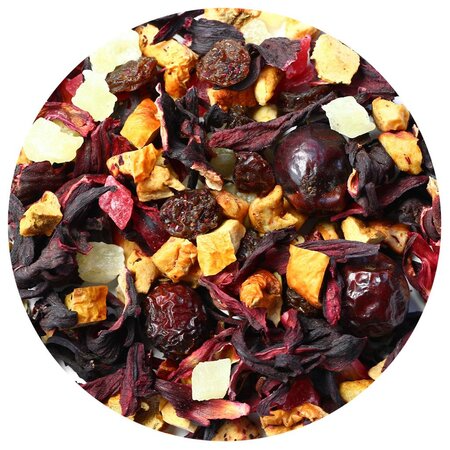 Яркий привкус это заслуга создателей столь необычайно фруктовой композиции, собравших все элементы напитка воедино. Гармонирующий аромат дикой вишни и корицы, сладость ананаса и изюма прекрасно сочетаются с кислинкой шиповника и гибискуса.