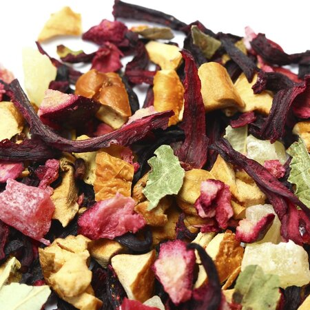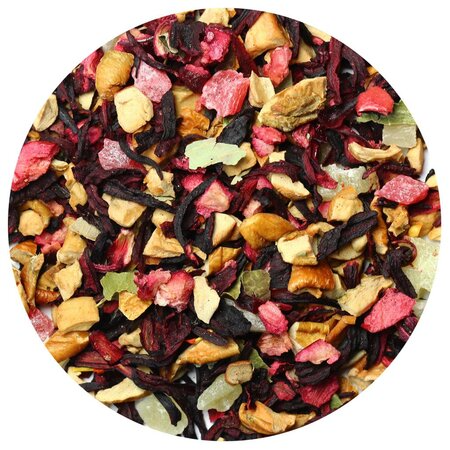 Каркадэ, кусочки яблок, кусочки ананаса, кусочки клюквы, листья смородины, аромат вишни.