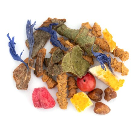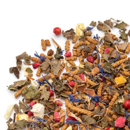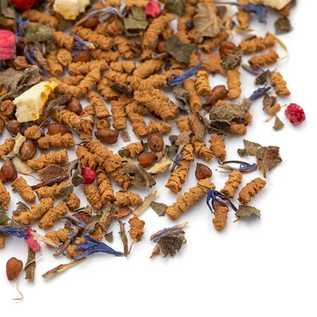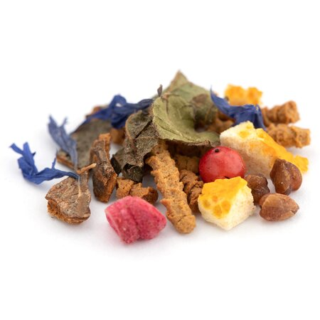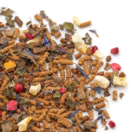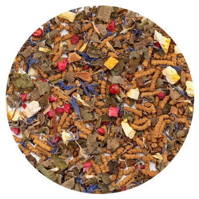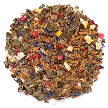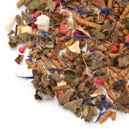 Гречишный чай, кусочки корицы, листья ежевики, кусочки апельсина с цедрой, кусочки малины, розовый перец, лепестки василька, аромат цитрусов и восточных пряностей.