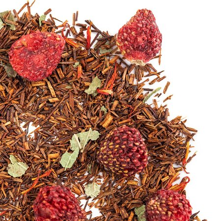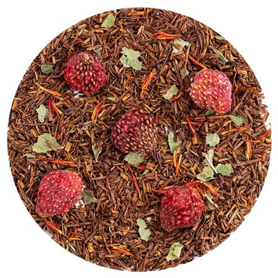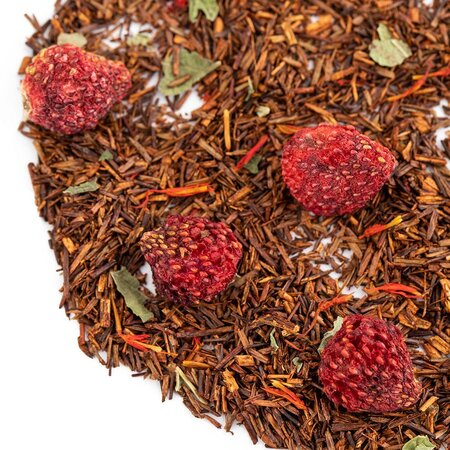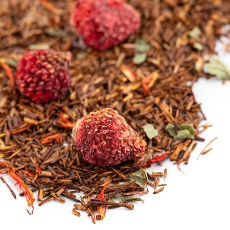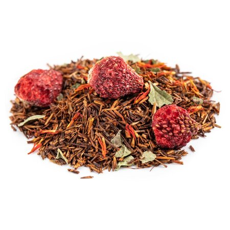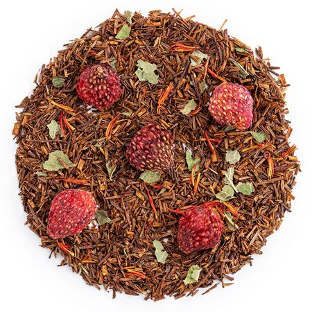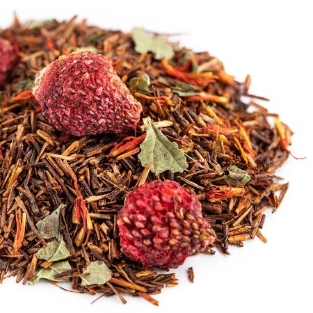 Чайный напиток на основе экзотического чая ройбос (ройбуш) с добавлением кусочков клубники, приправлен смородиновым листом и огненными язычками цветков сафлора.