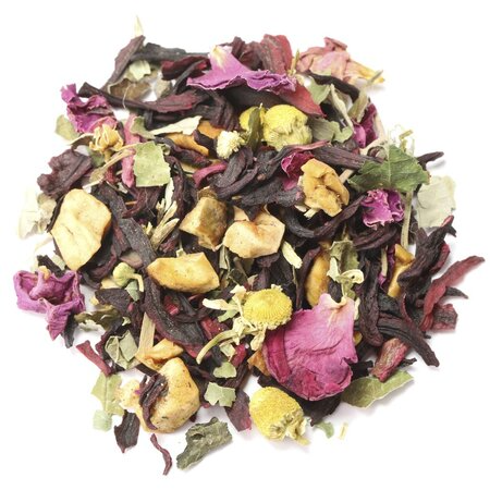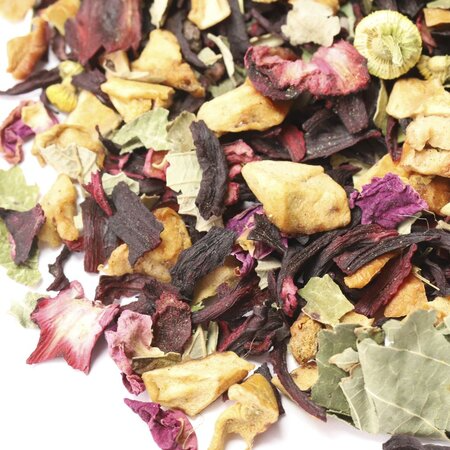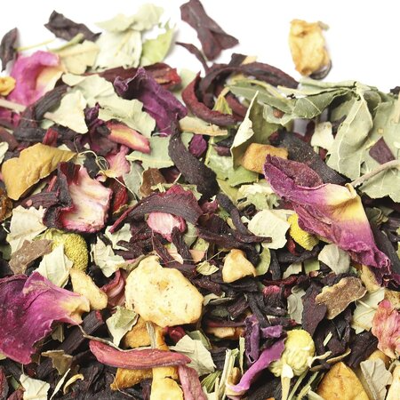 Каркадэ, кусочки яблок, листья крапивы, цветы ромашки, листья ежевики, листья смородины, лепестки розы красной, цвет липы, аромат малины и сливок.