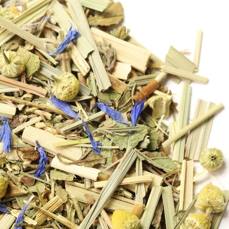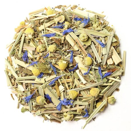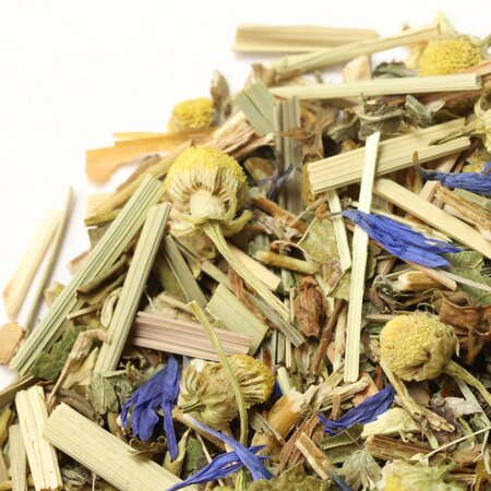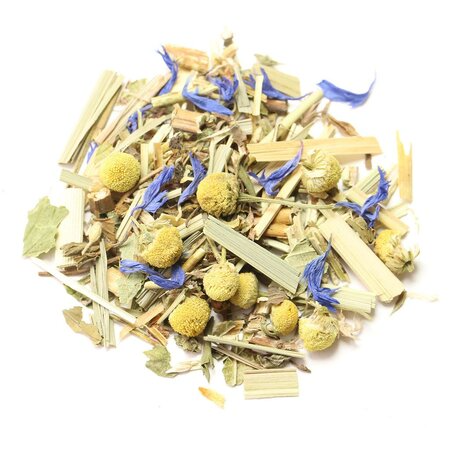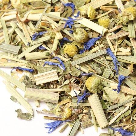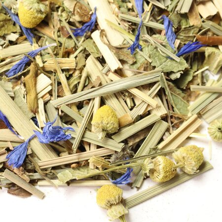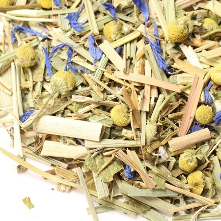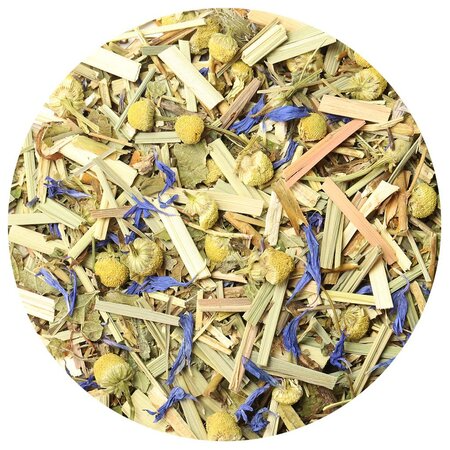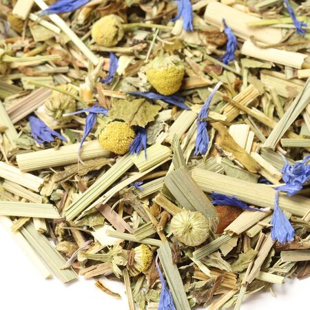 Мелисса, зверобой, лемонграсс, листья ежевики, листья мяты, цветы ромашки, лепестки василька