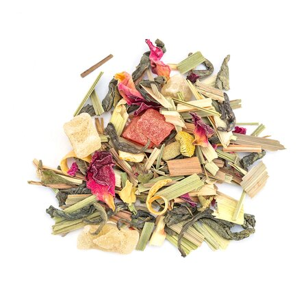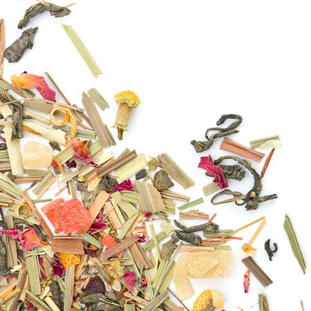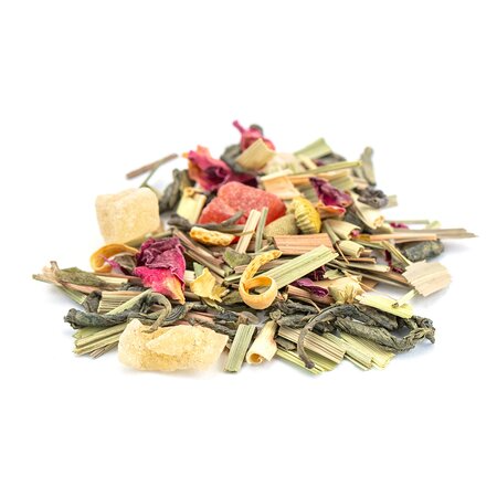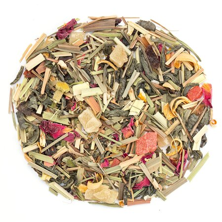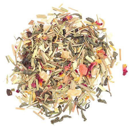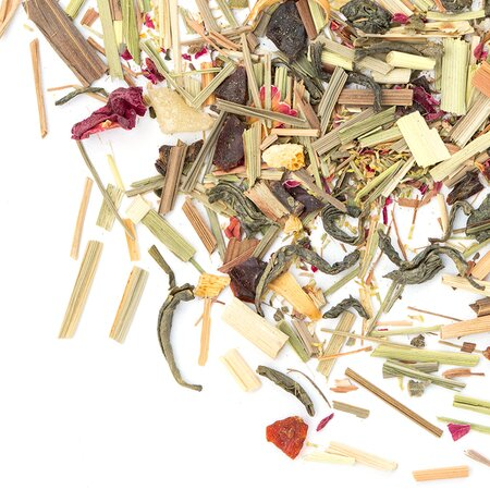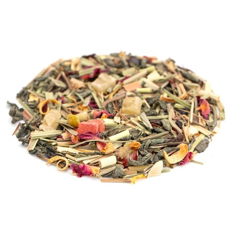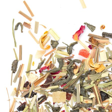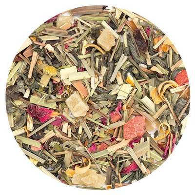 Лимонник, чай зеленый китайский, кусочки ананаса, шиповник измельченный, цедра апельсина, цветы апельсина, лепестки розы, ромашка, лепестки подсолнечника, листья ежевики.